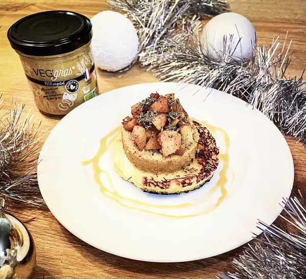 5. Démouler le Veg'Gras et le découper en jolis tronçons. En placer un sur chaque tranche de brioche. Ajouter les pommes par-dessus. Décorer avec un peu de thym et de miel.